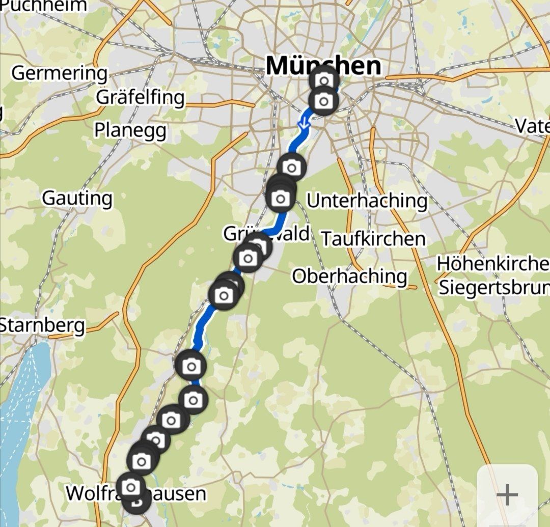Die Strecke startet traditionell mitten im trubeligen München am Marienplatz und führt dann an der Isar entlang bis nach Wolfratshausen. Abwechselnd links oder rechts der Isar geht es lange im Schatten der Wälder, vorbei an Pullach und dem Kloster Schäftlan. Die Tour kann an vielen Strecken abgekürzt werden. Mit der S-Bahn geht es anschließend zurück nach München.