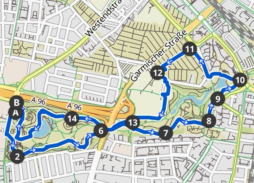 Von dort geht es quasi eine große Acht durch den Park durch beide Teile links und rechts neben dem mittleren Ring München.